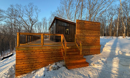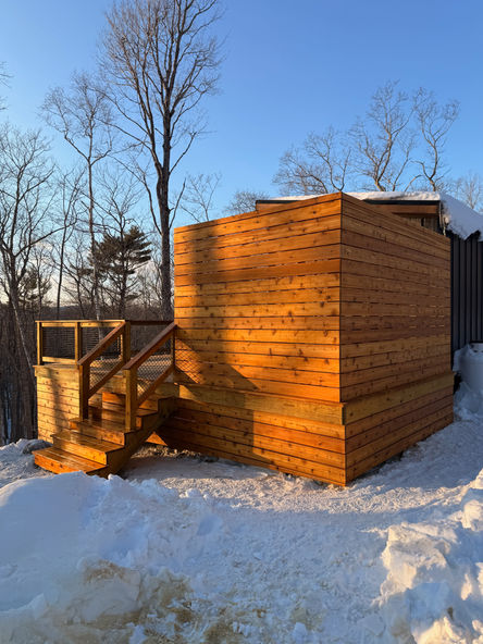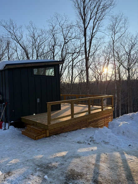 Deck // Rockport, ME: This Rockport, Maine tiny home is complemented by a 58-foot custom deck built with Western Red Cedar, thoughtfully designed to expand the living space and connect the home to its coastal surroundings. The natural durability and warmth of the cedar create an inviting outdoor area ideal for relaxing, dining, and taking in the Maine shoreline. Soon to be available as a coastal rental, this tiny home offers a simple, well-crafted retreat just steps from the sea.