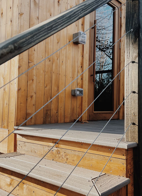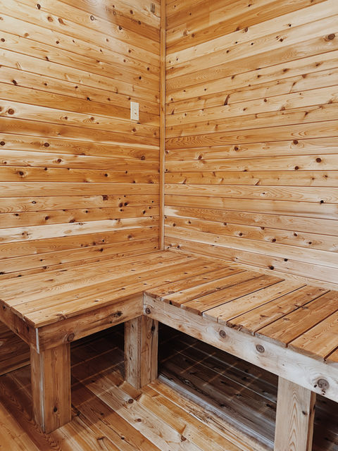 The interior is finished with locally milled cedar, adding a touch of rustic charm and enhancing the sauna’s soothing aroma. The rich, natural wood provides not only aesthetic beauty but also durability, creating a warm and inviting atmosphere for guests. Whether you’re unwinding after a day of outdoor adventures or simply seeking peace and quiet, this sauna offers a perfect balance of sustainability and luxury in the heart of nature.